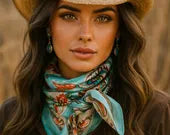 Elevate your western wardrobe with this striking turquoise wild rag, featuring an iconic 70's paisley pattern that commands attention. Cut to a generous 35" x 35" square, this versatile scarf delivers instant color and character to any ensemble. Crafted from silky-soft, 100% machine washable polyester, it's both durable and easy to care for. Pair it with our Western or Crystal slides to complete your look with coordinated style and flair.